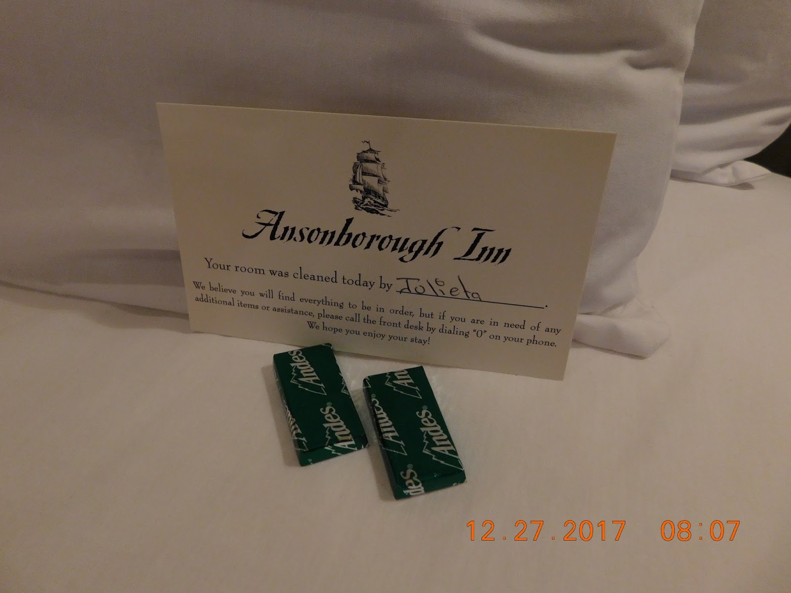 The four star Ansonborough Inn is a lovely surprise. Dark wood interior leads you to the soaring atrium with glass ceiling. Today, the hotel is decorated for Christmas and the lights are a lvoely addition to the lobby.